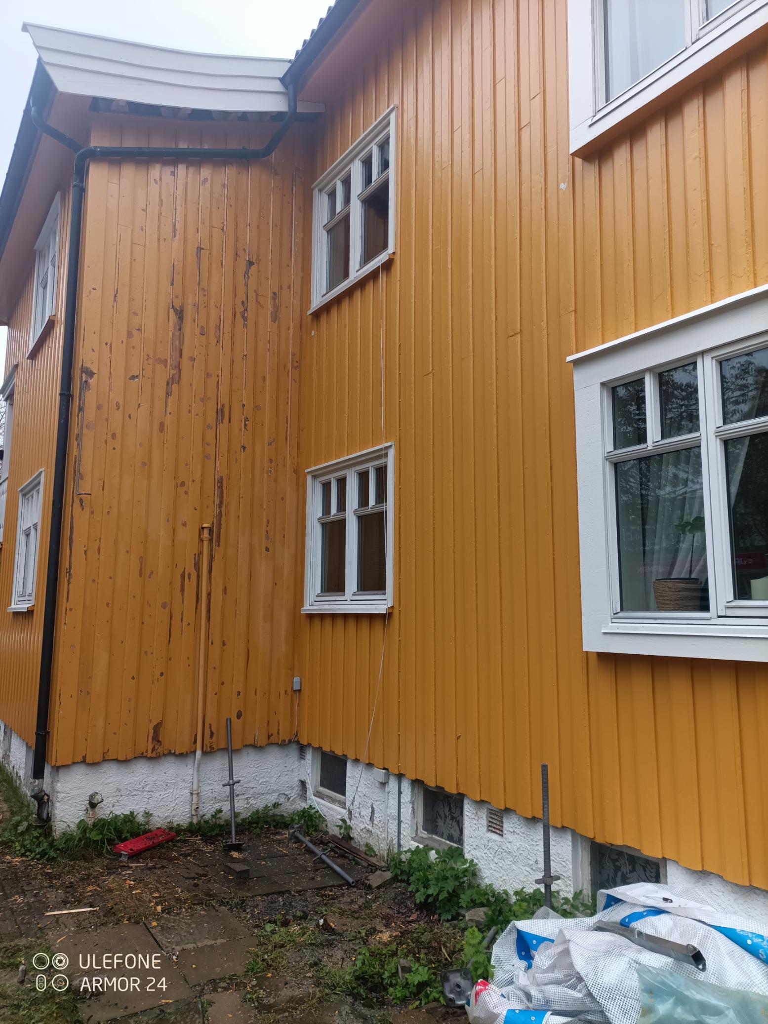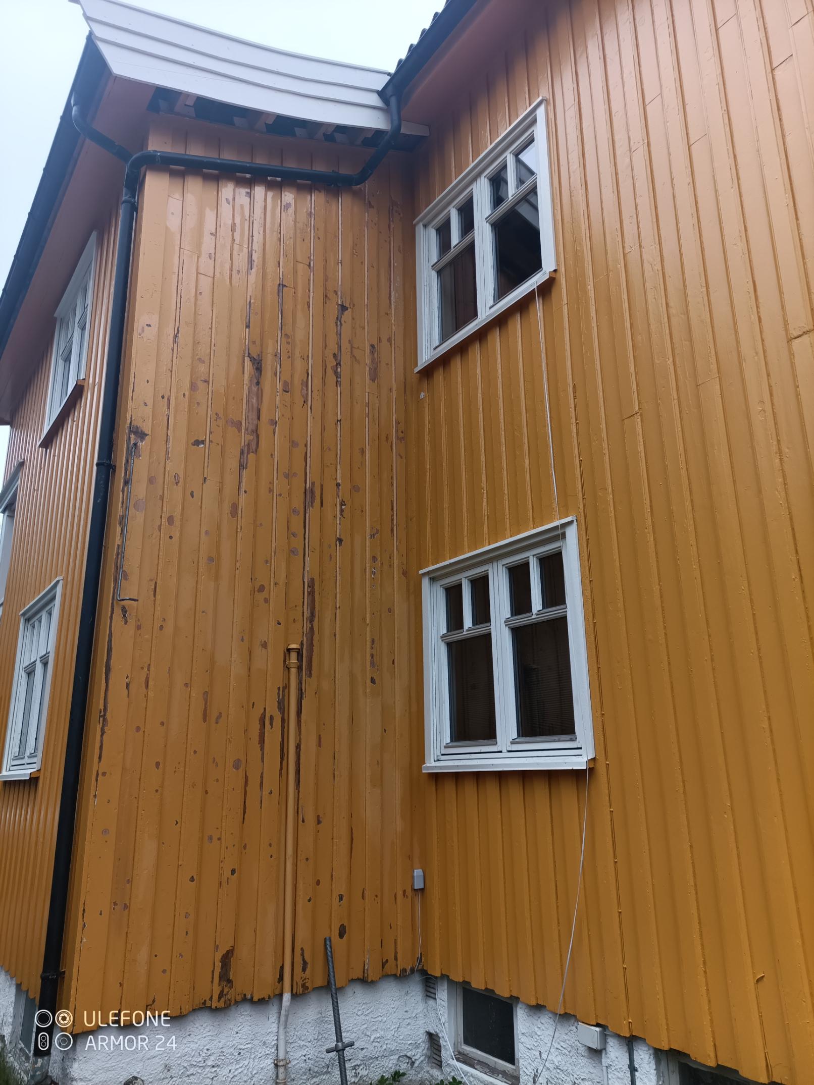 På bildet under ser du en gul husfasade som hadde fått hard medfart av vær og tid. Den ene veggen var preget av sprukket og flassende maling, med store områder der beskyttelsen var borte og treverket utsatt. Dette er ikke bare et estetisk problem – når malingen løsner, kan fukt trekke inn og føre til råteskader.