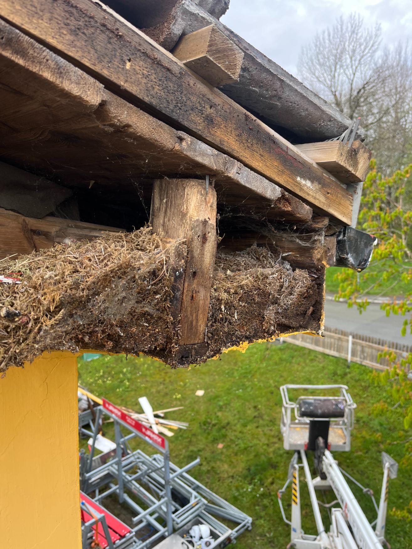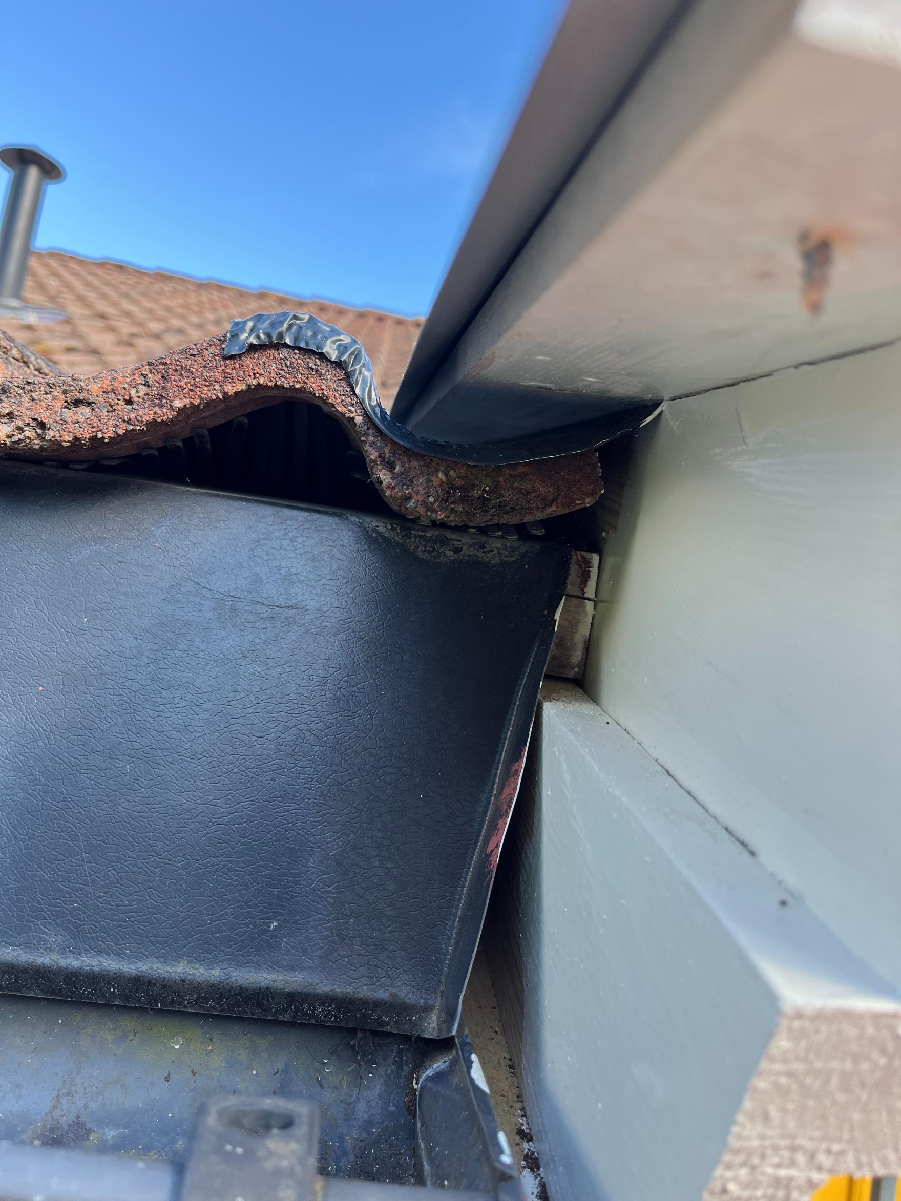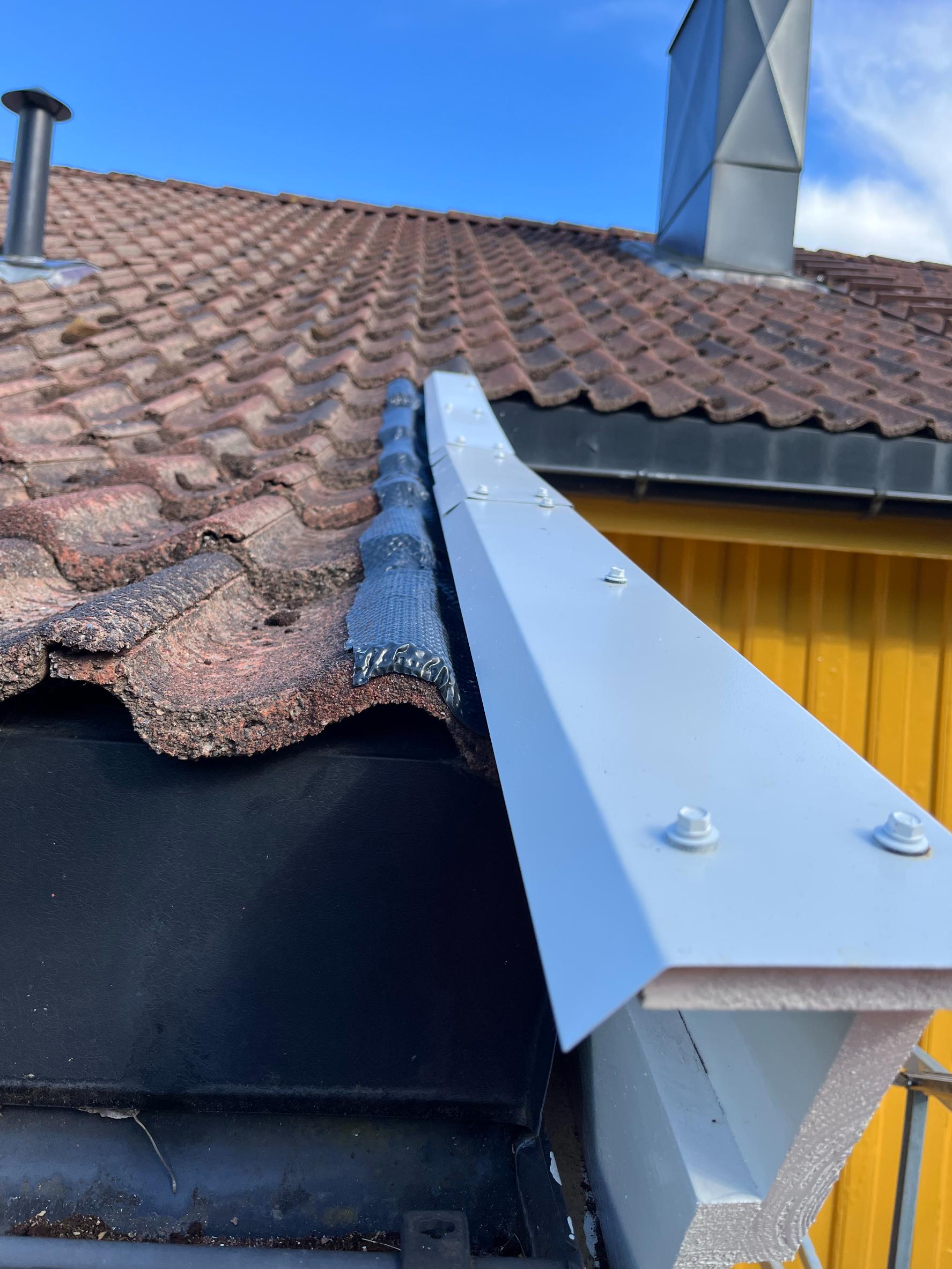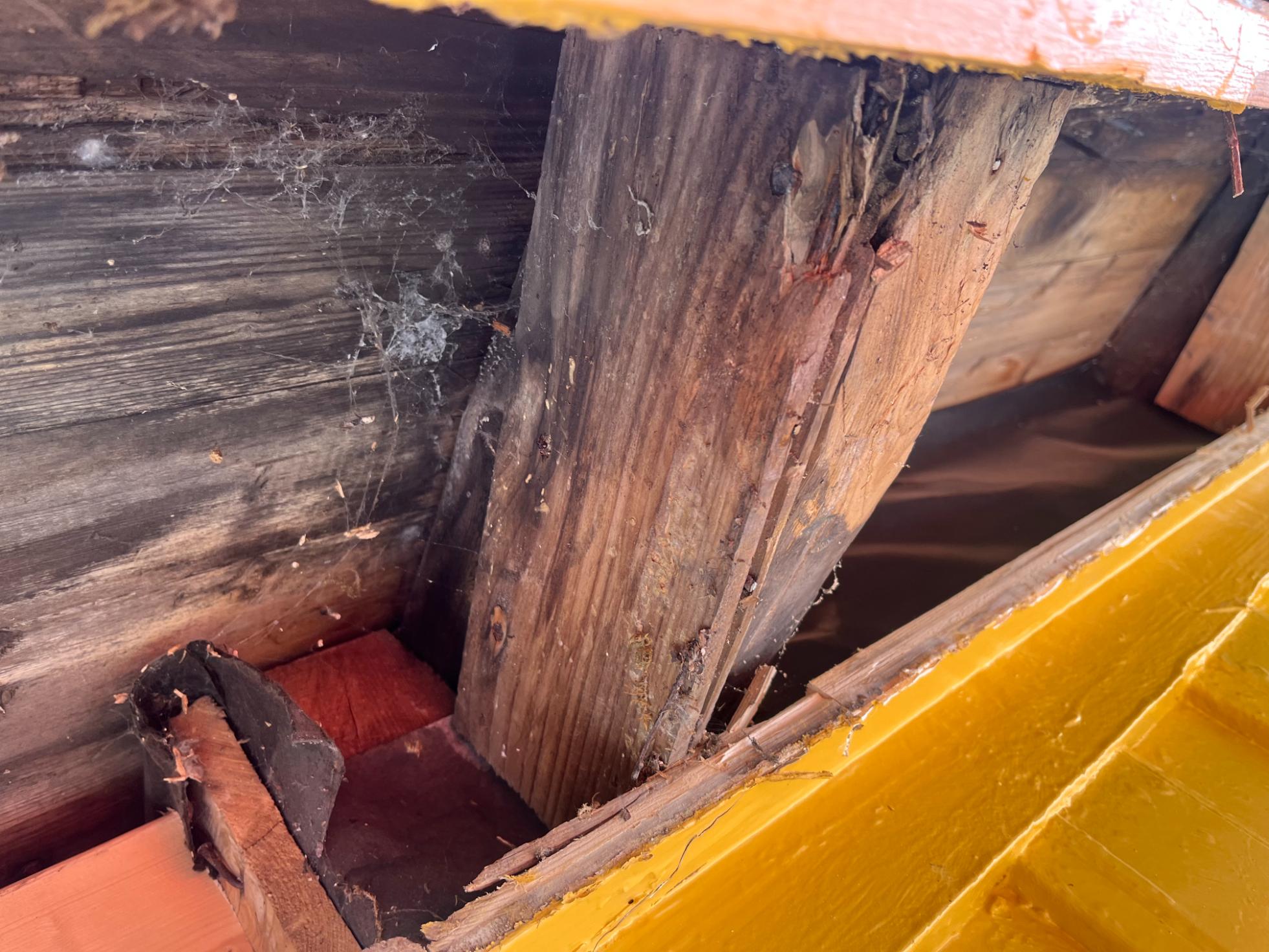 I samme prosjekt ble det avdekket svakheter i takets konstruksjon. Avslutningen på taksteinene mot vindski var mangelfull, noe som førte til at vann rant nedover vindskiene og inn i raftkassen – en klassisk oppskrift på fukt- og råteskader.